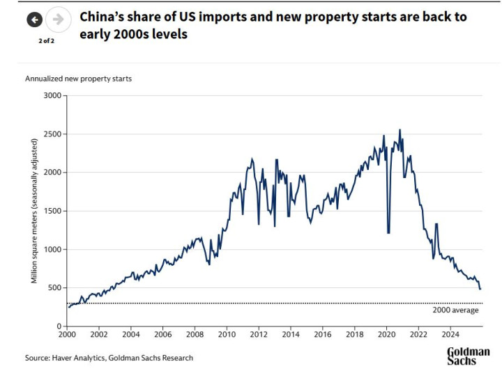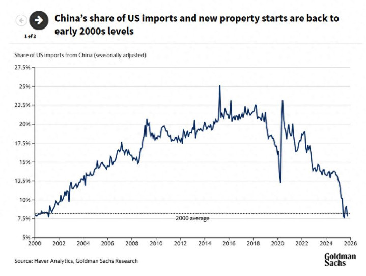 高盛研究首席中国经济学家Hui Shan在1月5日发布的报告中指出,近年来,受贸易战和房地产市场长期低迷的影响,中国经济发生了显著变化。去年,中国在美国进口中所占份额以及新屋开工量(衡量新建住宅项目的指标)均降至2000年代初期的水平。