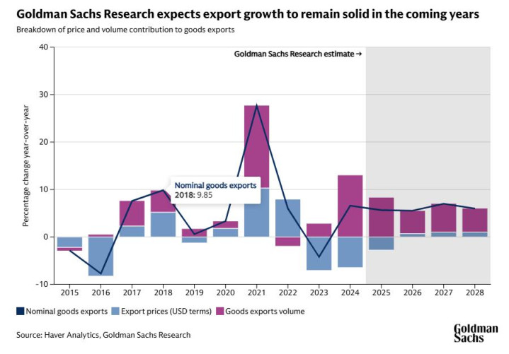 尽管美国提高了关税,但中国2025年的出口依然保持韧性,经通胀调整后的实际出口增长率有望达到8%左右。这部分得益于对新兴市场经济体出口的强劲增长。与此同时,出口价格的下降也使中国产品的竞争力日益增强。