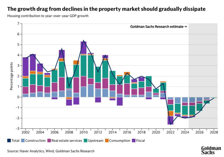 高盛研究部预计,未来几年房地产行业仍将拖累中国经济增长,但预计这种拖累对年度实际GDP增长的影响——2024年和2025年约为2个百分点——将在未来几年内每年缩小0.5个百分点。